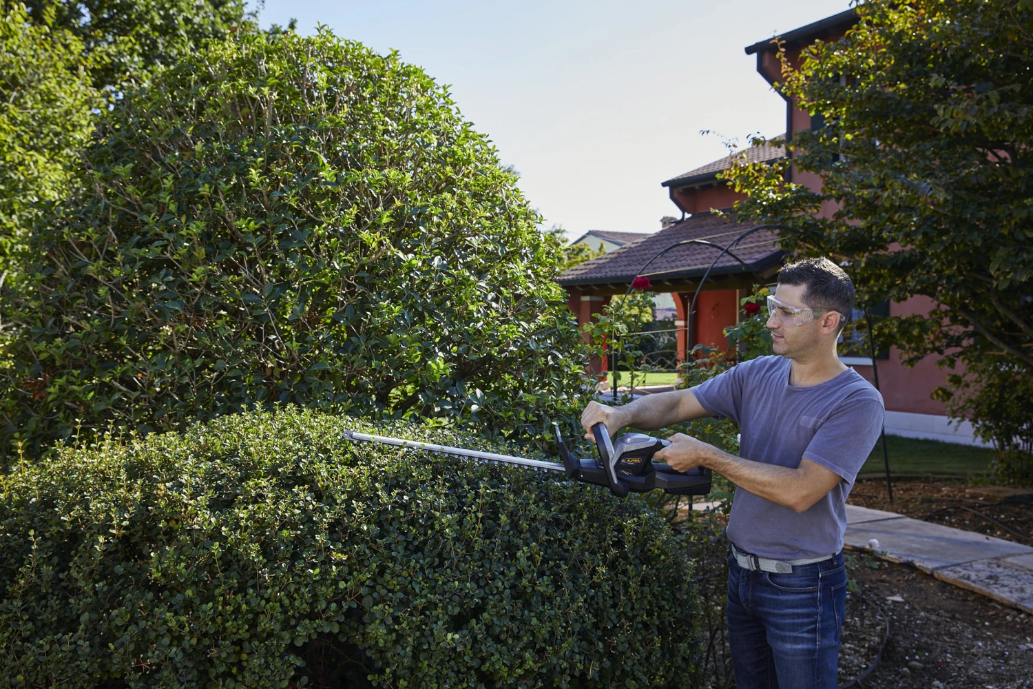 Mit der ALPINA Akku-Heckenschere AHT 20 Li sind kleine bis mittelgroße Hecken im Handumdrehen erledigt. Die kabellose Freiheit und das geringe Gewicht der AHT 20 Li sorgen für Begeisterung. Die Heckenschere ist mit einem lasergeschnittenem Messer mit Doppelschnitt und einer Schnittlänge von 50 cm ausgestattet. Der Zahnabstand des Messers misst 18 mm und kann somit auch dickere Zweige schneiden. Für einen sicheren Schnitt an Wegen und Wänden ist das Schwert mit einem Schwertspitzenschutz ausgestattet. Für die nötige Energie sorgt der ALPINA Akku B 220 (20 Volt, 2 Ah), mit dem die Heckenschere bis zu 40 Minuten genutzt werden kann. Der ALPINA Akku B 220, ein Schwertschutz und ein Ladegerät sind im Lieferumfang enthalten.