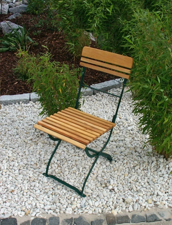 Alle Hölzer sind sauber verarbeitet. Die Gestelle sind aus massivem Flach- und Rundstahl gefertigt und im klassischen moosgrün (RAL 6005) pulverbeschichtet.