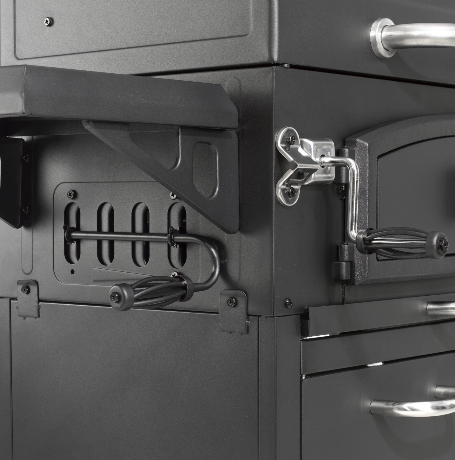 Holzkohlegrill aus Stahl im klassischen Tresordesign und reichhaltigem Funktionsumfang.
