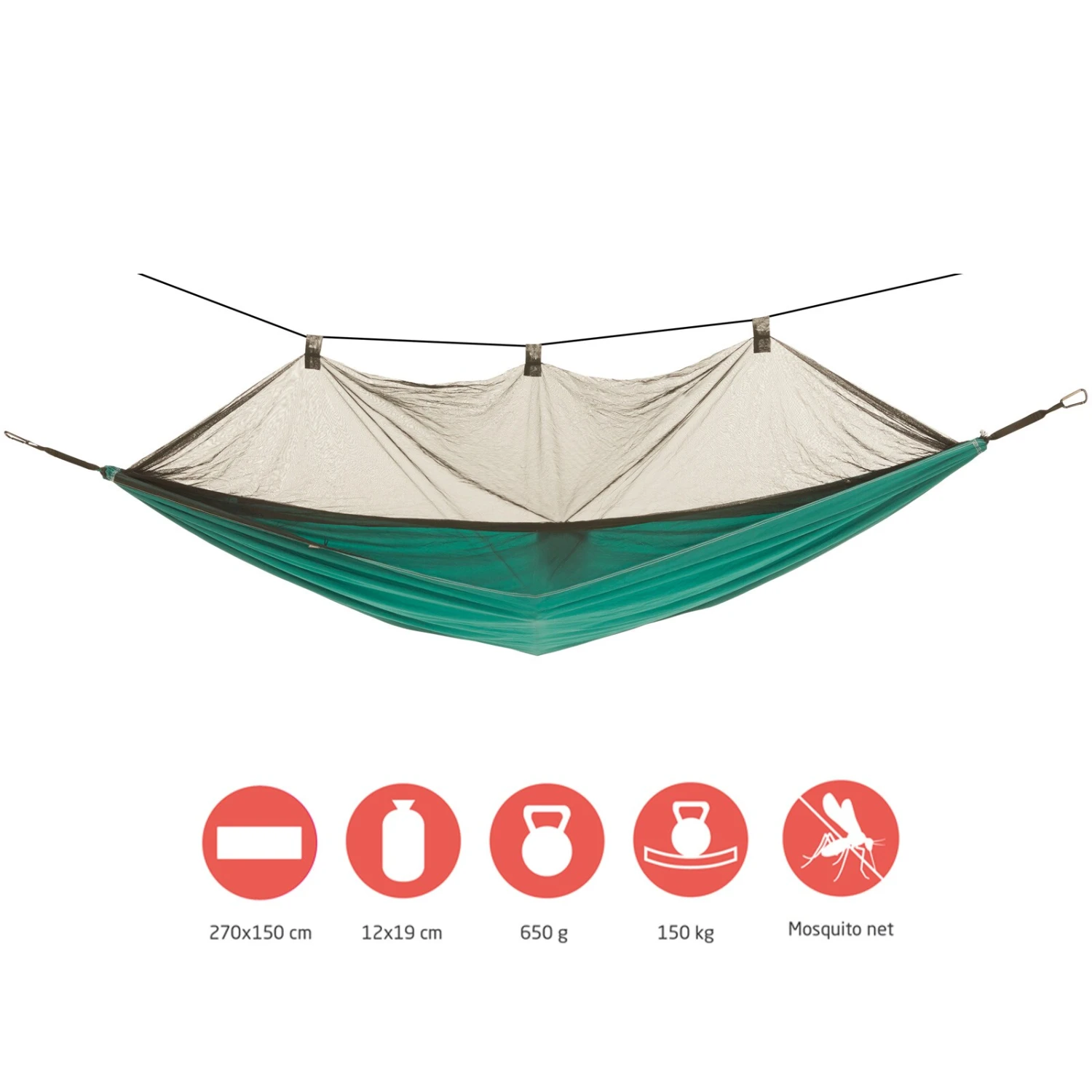 Die Hängematte ist mit einem angenähten Moskitonetz mit Reißverschluss ausgestattet, das Sie vor Insekten & anderem Getier schützt und Ihnen entspanntes Schlafen im Freien ermöglicht.