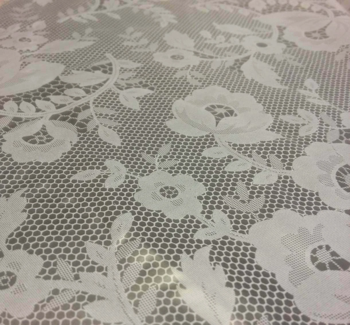 Tischdeckenschoner in Transparent mit weißem Blumenaufdruck. Alle Schoner sind mit einem Paspelband umnäht. Wetterfest, farbecht und abwaschbar. Klebt nicht.