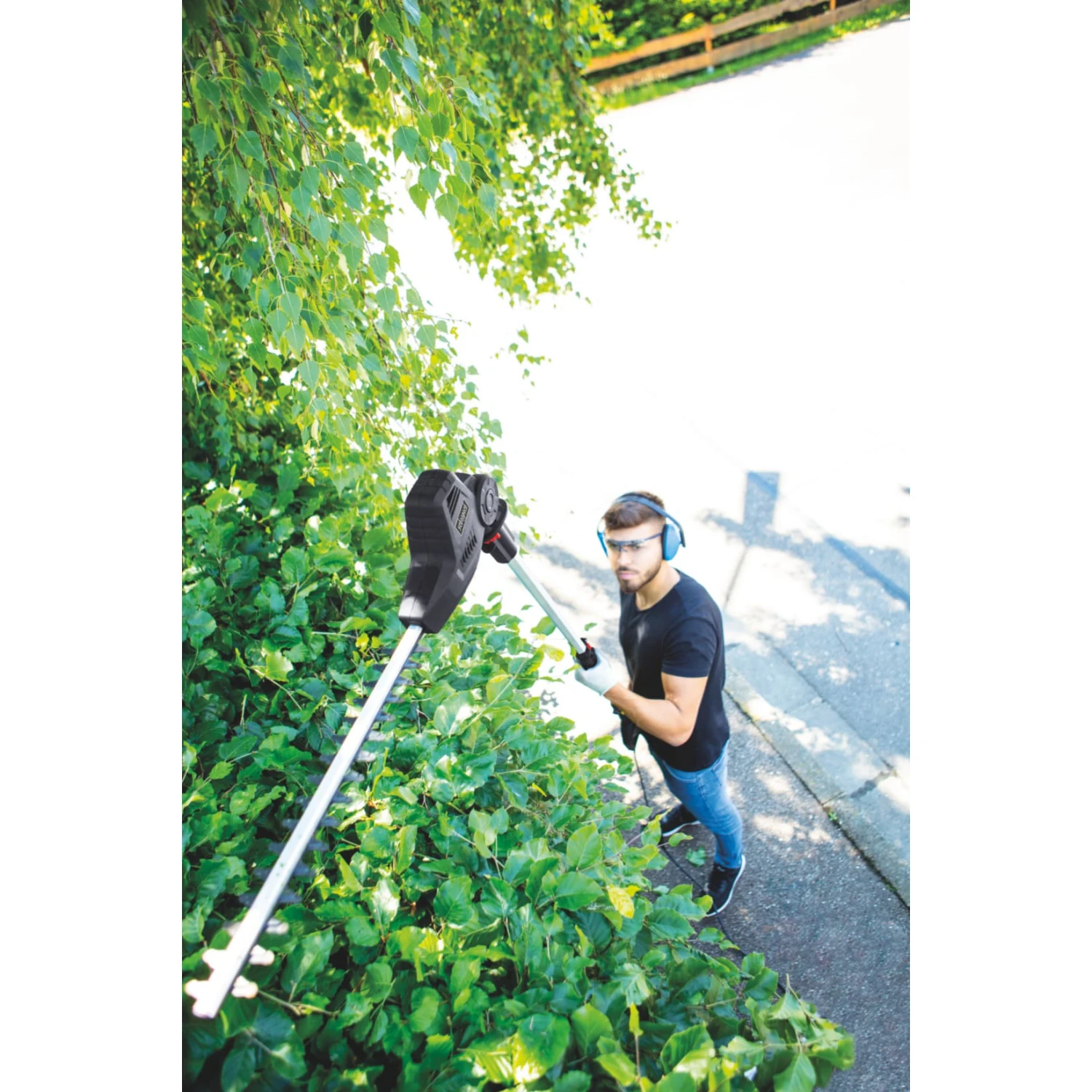 Mit der Scheppach Heckenschere HTH250/240P – 1PSschneiden Sie Ihre Hecke auf sicherem Boden, ohne auf einer Leiter zu stehen. Das ideale Werkzeug für hohe Hecken und Sträucher.