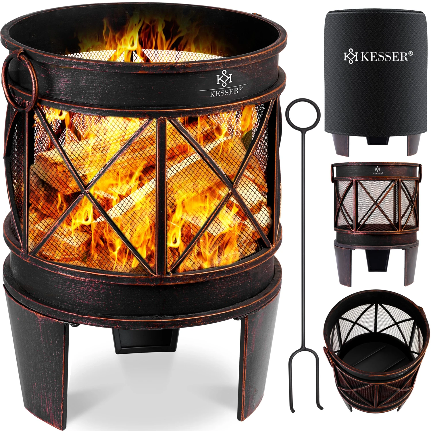 KESSER Feuerschale mit geräumigem Volumen, hoher Tragkraft von 10Kg und Funkenschutz dank feinem Stahlgitter, robuste Griffe und Schürhaken, stabiler Dreifuss für sicheren Stand, UV, rost- und wetterfest, Kreuzstreben Design für eine rundum Wärmeverteilung