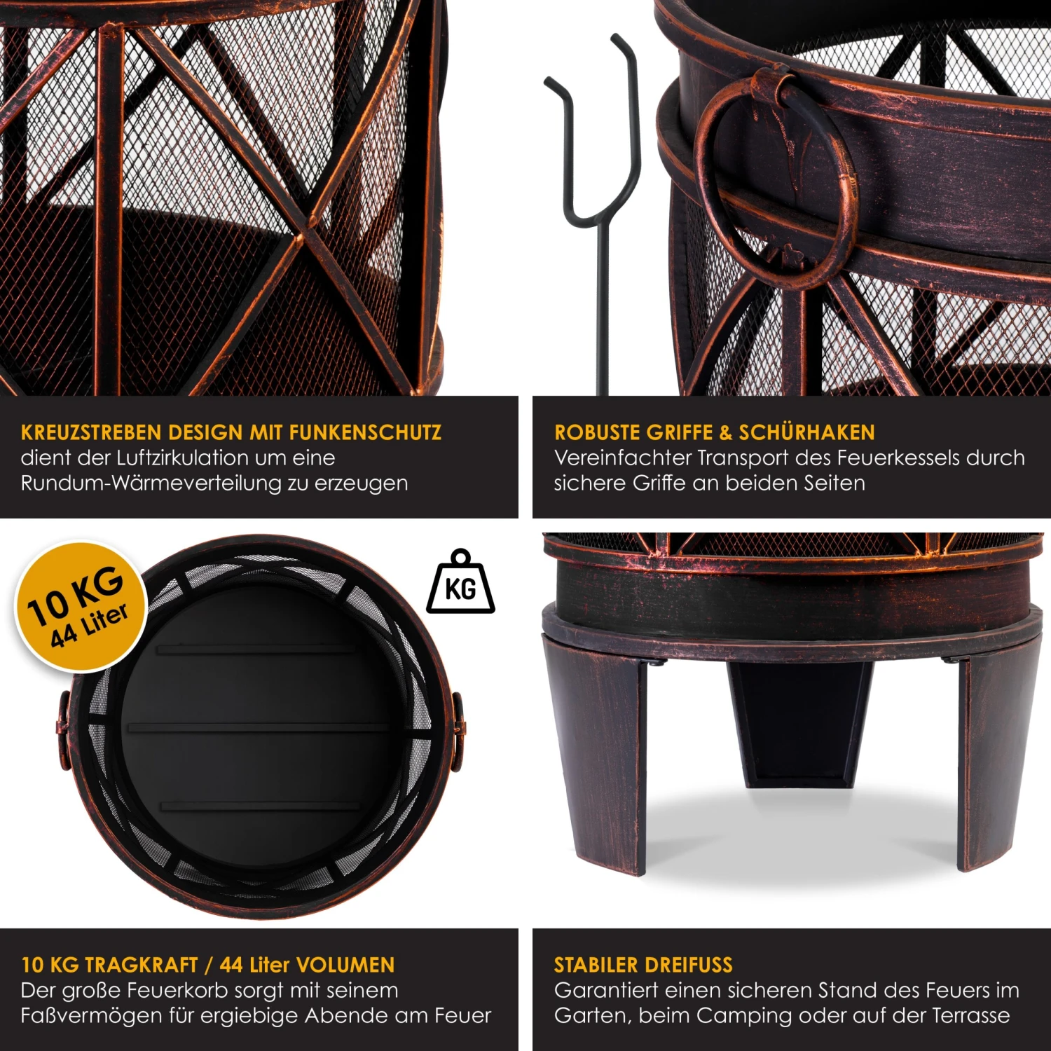 Die robuste Feuerstelle garantiert einen sicheren Stand des Feuers im Garten, beim Camping oder auf Ihrer Terrasse. Der große Feuerkorb sorgt mit seinem Fassungsvermögen von 44 Liter für ergiebige Abende am Feuer. Außerdem können Sie genügend Brennholz in unsere Feuerschale füllen, denn durch die Tragkraft von 10 Kg wird Ihnen ein langes Feuer garantiert. Der Transport wird zusätzlich durch robuste Griffe an beiden Seiten vereinfacht und mit dem mitgelieferten Schürhaken lässt sich Glut und Holz ideal verteilen.