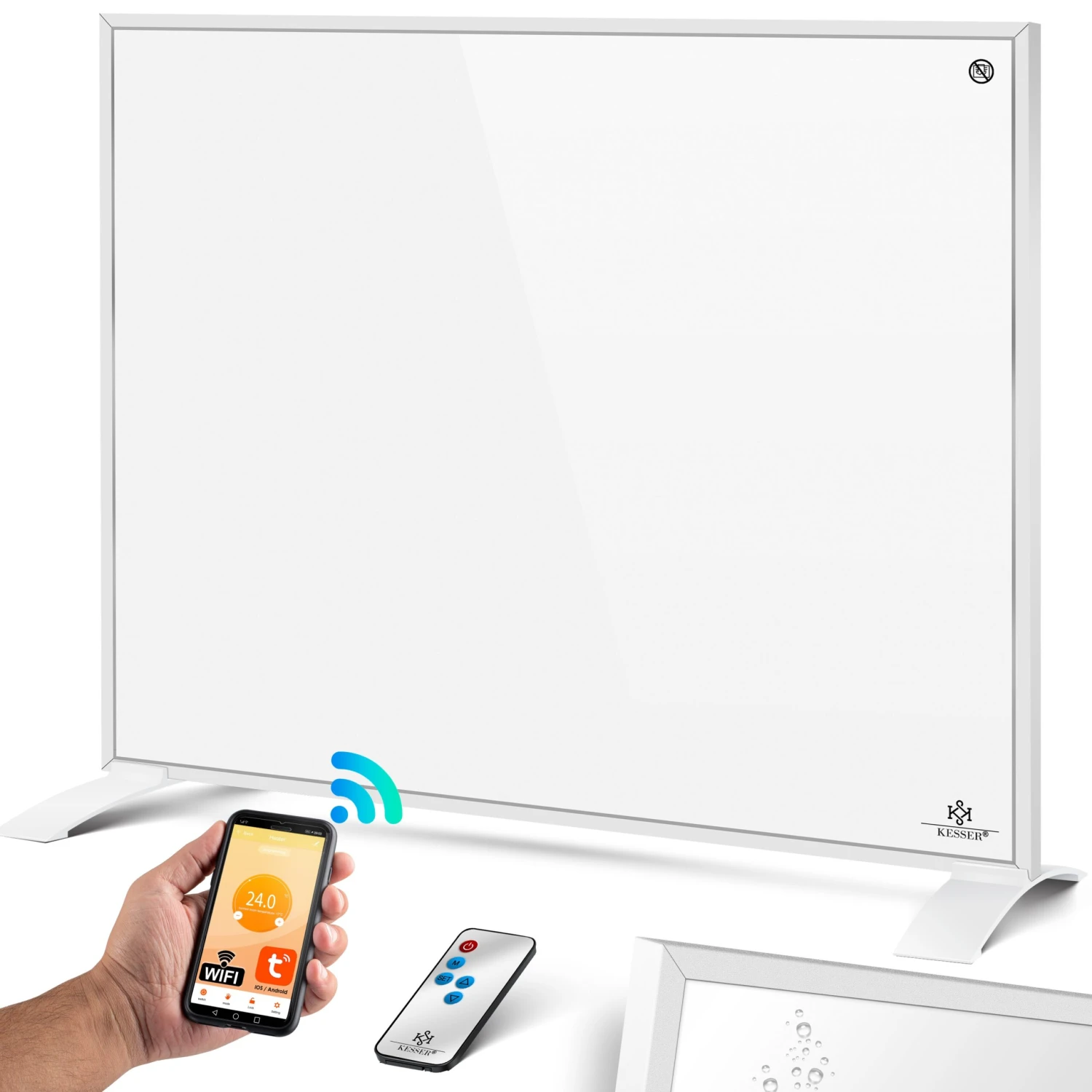 KESSER Infrarotheizung 2in1 – Wandmontage oder aufstellen, IP44 Schutzklasse, effizientes Heizen, Spritzwasserschutz, inkl. Thermostat, Timerfunktion, Carbon-Kristall-Heizplatte, LCD-Display, Tuya Smart-App und SprachsteuerungKESSER – Einfach BESSER durch den Winter!Gerade Bewohner unter uns mit Altbauten oder höheren Decken kennen das Problem: Es kostet ungemein viel Zeit und Geld, bis die eigene Heizung eine angenehme Temperatur im Raum spendet. Die Ursache dafür ist die physikalische Gesetzmäßigkeit, dass warme Luftmassen aufsteigen. Ein herkömmlicher Heizkörper wärmt den Raum also unnötig von oben nach unten, dabei sammelt sich die Wärme erst einmal nutzlos unter der Decke – eine nicht zu unterschätzende und teure Energieverschwendung.Eine Infrarotheizung kann heutzutage als Ersatz für eine Ölheizung, für eine Gasheizung oder für viele weitere Heizsysteme zum Einsatz kommen. Herkömmliche Heizungen erwärmen laut Testbericht sehr schlecht, denn die Wärme steigt einfach nur nach oben und wirbelt dabei unnötigen Staub und Schmutz auf. Stattdessen erwärmt unsere Infrarotwandheizung Lebewesen sowie Gegenstände, auf welche die infrarote Strahlung in unmittelbarer Nähe stößt und ist daher auch allergikerfreundlich. So kann unsere innovative Heizung beispielsweise Möbel, Böden, Wände, Menschen sowie Tiere erwärmen. Dabei ist die Vorheizzeit vergleichsweise zu herkömmlichen Heizgeräten ziemlich kurz und somit deutlich energiesparender. Unser Heizsystem ist einfach die perfekte Lösung für einen schnelllebigen Alltag. Zertifiziert mit einer IP44 Schutzklasse wird Ihnen ein optimaler Schutz gegen Wasserspritzer garantiert. Zusätzliche Sicherheit gewährt Ihnen ein integrierter Überhitzungsschutz, somit schaltet sich unser Ofen im Notfall ab und ein Befeuern ist nicht möglich.Die hochwertige Produktion gewährt neben der Funktion auch ein langlebiges und hochwertiges Heizsystem. Für die Wärmebildung durch die Infrarotstrahlen sorgen diverse Platten, welche von einer Montageplatte auf der Rückseite und einer Frontplatte gehalten werden. Aufgebaut durch eine Platte für eine ideale Isolation, und einem Infrarotheizelement wird Ihnen die bestmögliche Wärmeentwicklung in nur 37 Sekunden garantiert. Neben der Steuerung über das hochwertige LCD-Display gibt es noch weitere Zugriffmöglichkeiten auf die Infrarotheizung. Dank der mitgelieferten Thermostat Fernbedienung, der integrierten WiFi APP-Funktion oder sogar Sprachfunktion welche kompatibel mit Alexa, Google Assistant und Siri ist, wird Ihnen ermöglicht, die gewünschte Temperatur bequem aus der Ferne einzustellen. Unser Heizkörper überzeugt durch unterschiedliche Routineprogramme, diese können Sie je nach Wunsch automatisch oder auch manuell nutzen. Legen Sie neben der Temperatur einen gewünschten Zeitraum inklusive der Stärke fest. Zusätzlich stehen Ihnen viele Steuerungsoptionen zur Verfügung. Sie können per Knopfdruck ganz leicht die Temperatur erhöhen oder auch senken. Wählen Sie aus verschiedenen Programmen das für Sie perfekt abgestimmte Programm aus und genießen Sie die Wärme. Ein integriertes Thermostat misst die Temperatur für Sie mit und gibt Ihnen in Echtzeit die aktuelle Temperatur vor. Über einen einfachen Knopfdruck können Sie auch Ihre Wunschtemperatur bis zu 37°C einstellen.Sparen Sie bares Geld mit unseren Steuerungsmöglichkeiten. Heizen Sie Ihre Räume nur dann, wenn es nötig ist. Durch flexibles Steuern haben Sie die Möglichkeit, Ihre vier Wände effizient zu wärmen. Für Ihre unterschiedlich großen Räumlichkeiten ist die Heizung aus dem Hause KESSER mit unterschiedlichen Leistungen zu haben. Damit eignet sich der Radiator mit einer effektiven Oberflächentemperatur ideal für größere und kleinere Räume. Der Radiator lässt sich zudem in Gartenhäusern und Wintergärten installieren, so steht auch Ihrer nächsten Gartenparty im Winter nichts mehr im Weg. Wer kennt es nicht? Man kommt an kalten Wintertagen aus der Dusche und der Raum ist eiskalt, denn das Badezimmer wird statistisch gesehen am wenigsten beheizt. Kein Grund zur Sorge, mit unserem innovativen Wärmestrahler betreten Sie nach dem Duschvorgang dank Timerfunktion einen mollig warmen und angenehmen Raum. Und die Elektrik im Bad? – Selbst dafür haben wir gesorgt! Mit unserem Spritzwasserschutz sind Sie auch hier auf der sicheren Seite, denn die Elektroheizung schaltet sich bei Kontakt mit Wasser direkt ab.Ein weiterer Vorteil besteht in der Flexibilität, wechseln Sie die Heizsonne an Ihren Wunschort, wenn Sie es gebrauchen. Unsere Heizung heizt problemlos größere Räume, aber auch kleine Räume lassen sich mit unserm Radiator bestens ausstatten. Und auch optisch überzeugt der moderne und stylische Heizapparat in der jeder Hinsicht und bleibt in jedem Raum ein Highlight. Unsere Heizplatten gibt es in verschiedenen Größen, so finden Sie den perfekt abgestimmten Heizkörper für Ihren Raum. Mit einer Gesamtlaufzeit von bis zu 100.000 Stunden, was ungefähr 11 Jahren entspricht, erwartet Sie eine hochwertige und langlebige Heizvorrichtung für Ihr Zuhause.Unser Lieferset beinhaltet neben der Infrarotheizung alles, was für die Installation wichtig ist. Suchen Sie sich nach dem auspacken der Heizplatte mit einem SuperFlat-Design einfach nur Ihre gewünschte Wand für die Montage aus. Anzeichnen, Bohren und die mitgelieferten Dübel einsetzen und anschließend mit den Schrauben die Aufhängung anschrauben oder mit den montieren Sie die praktischen Metall-Standfüße und stellen Sie die Heizung im Raum auf. Im Anschluss kann einem kalten Tag nichts mehr im Wege stehen.Produkt-Highlights:• inkl. Thermostat• Schnelle und einfache Wandmontage• IP44 Schutzklasse• Inkl. Metallfüße• Effizientes Heizen• Spritzwasserschutz• Wandelt 98% der Energie in Wärme um• Kindersicherung• Lebensdauer bis zu 100.000 Stunden (etwa 11 Jahre)• Smarte Bedienung durch Fernbedienung• WiFi• APP- u