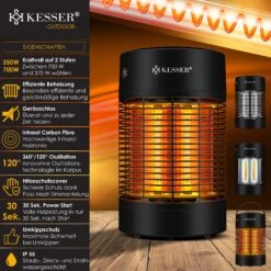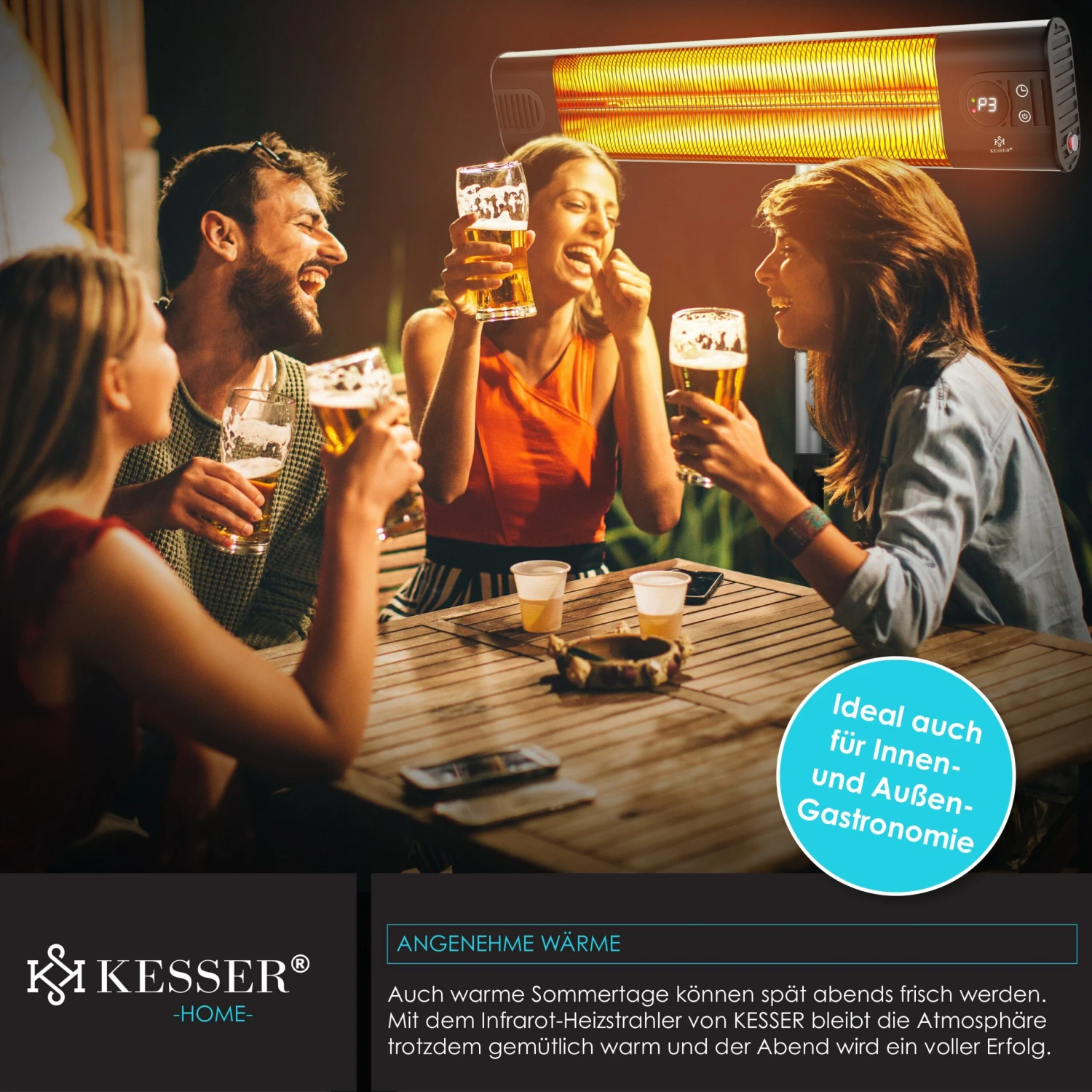 Der KESSER Infrarot–Heizstrahler ist aufgrund seiner hohen Qualität zu einer idealen Wahl für den privaten und gewerblichen Gebrauch geworden. Mit dem eleganten Design, der hochwertigen Verarbeitung und den effizienten Funktionen eignet sich unsere Infrarotheizung sehr gut für den modernen Außenbereich oder die Gastronomie. Dank der angenehmen, sonnenähnlichen Strahlungswärme, können Ihre Gäste, Freunde und Familie auch bei feucht–kaltem Wetter draußen sitzen.