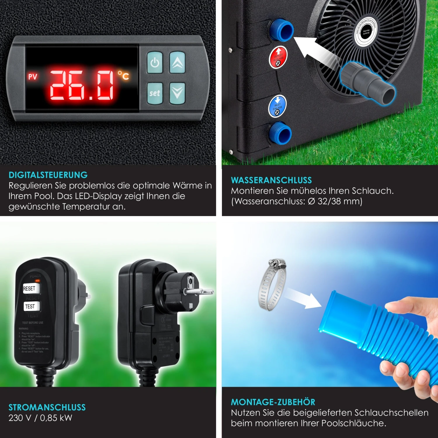 Über die integrierte Digitalsteuerung haben Sie volle Kontrolle über die Wunschtemperatur. Regulieren Sie problemlos die optimale Wärme in Ihrem Pool. Das integrierte LED–Display zeigt Ihnen jederzeit die gewünschte Temperatur an. Entspannen Sie in Ihrem Pool und schalten Sie alles um sich herum ab, mit einem geringen Schalldruckpegel von nur 37dB (A) können Sie tiefenentspannt das Wetter und die Abkühlung im Wasser genießen.