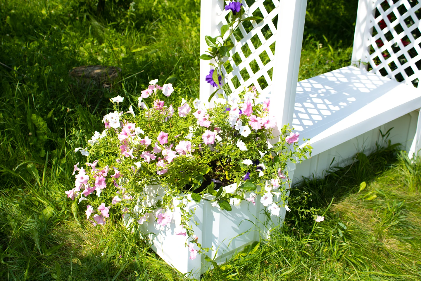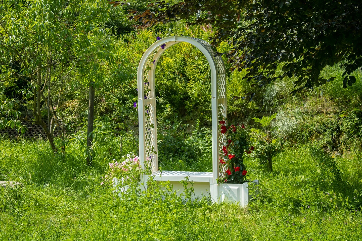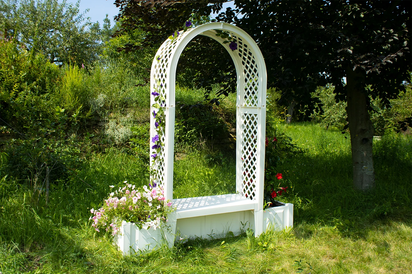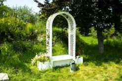 Stabile Gartenbank mit 2 Pflanzkästen und Rundbogen.