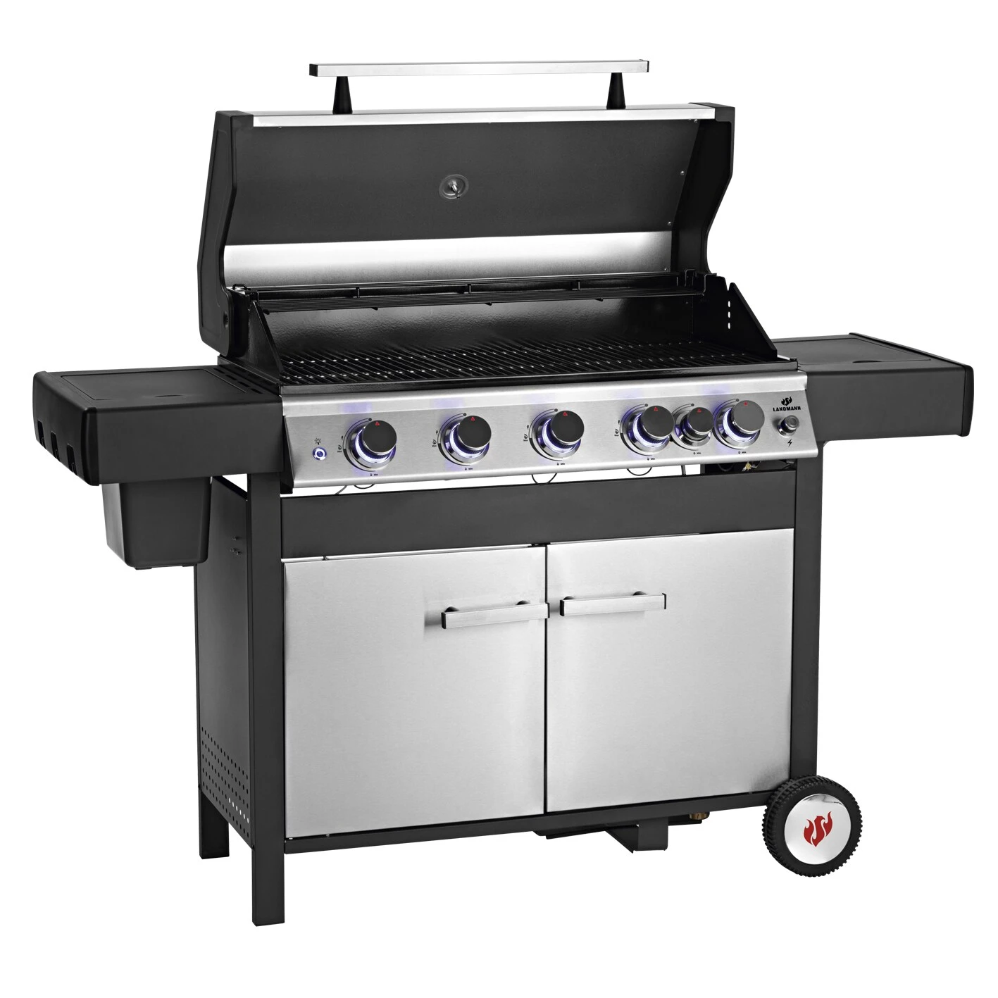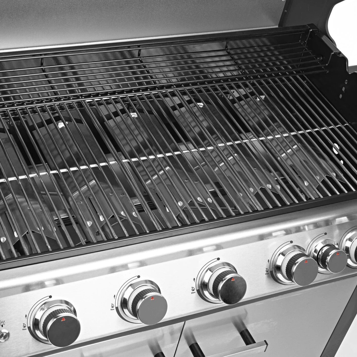 - Gasgrillwagen mit 5 stufenlos einstellbaren Brennern (18 kW) für unterschiedliche Garzonen und im Regler integrierter Piezo-Zündung für heiße Temperaturen bis zu 300 °C