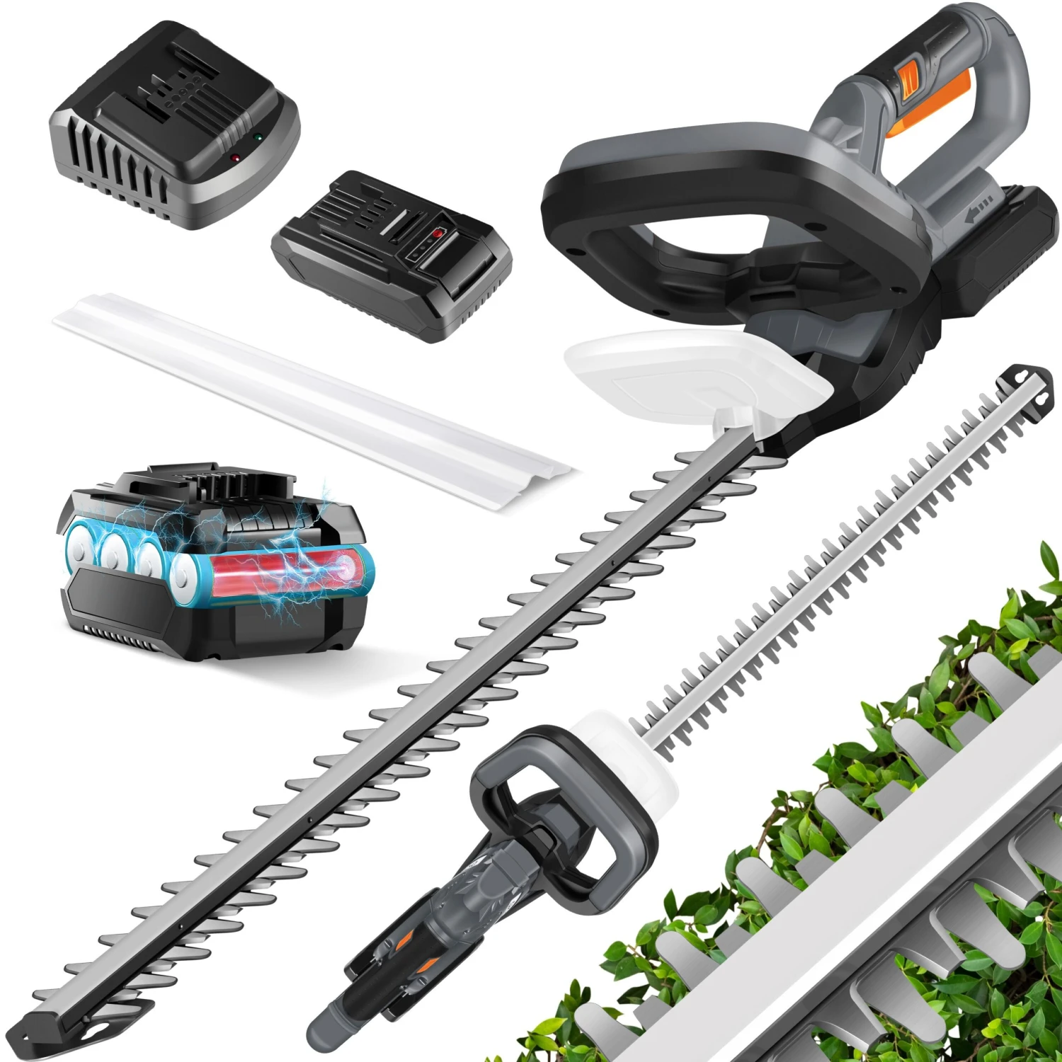 MASKO Heckenschere kabellos mit integrierter Aufhängvorrichtung und schwenkbarem Griff, vollgeladen in nur 0,5 Stunden, kraftvolle 2200 Schnitte pro Minute, Zweihand-Sicherheitssystem, diamantgeschliffene Schneiden für müheloses scheiden von Büschen und Sträuchern, inkl. Lithium Akku und Ladegerät