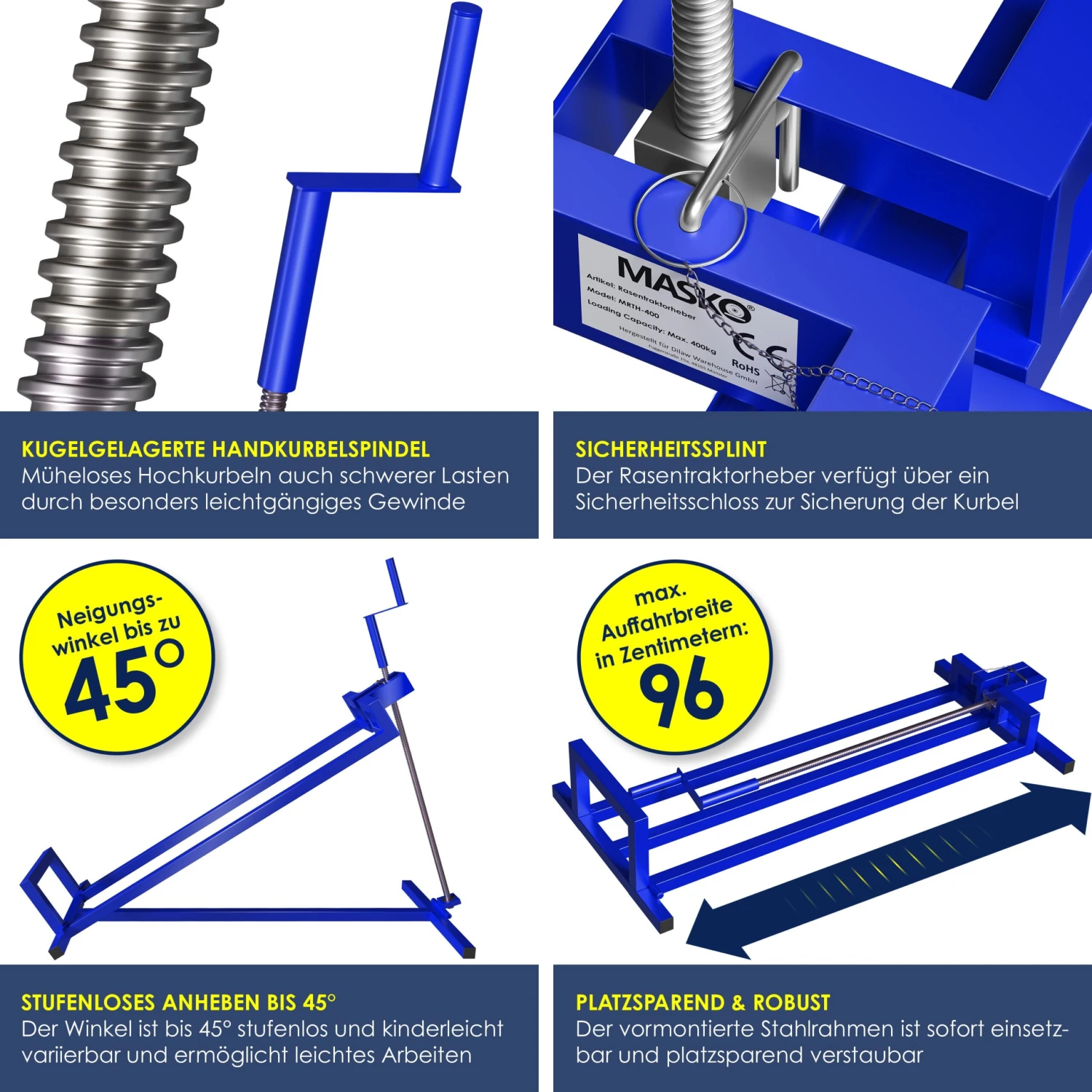 Der MASKO Rasentraktorheber ist der ideale Helfer zur Pflege und Wartung von Aufsitzmähern, Kleintraktoren, Quads sowie für alle Arten von Rasenmähern. Die maximale Tragfähigkeit beträgt 400 kg.