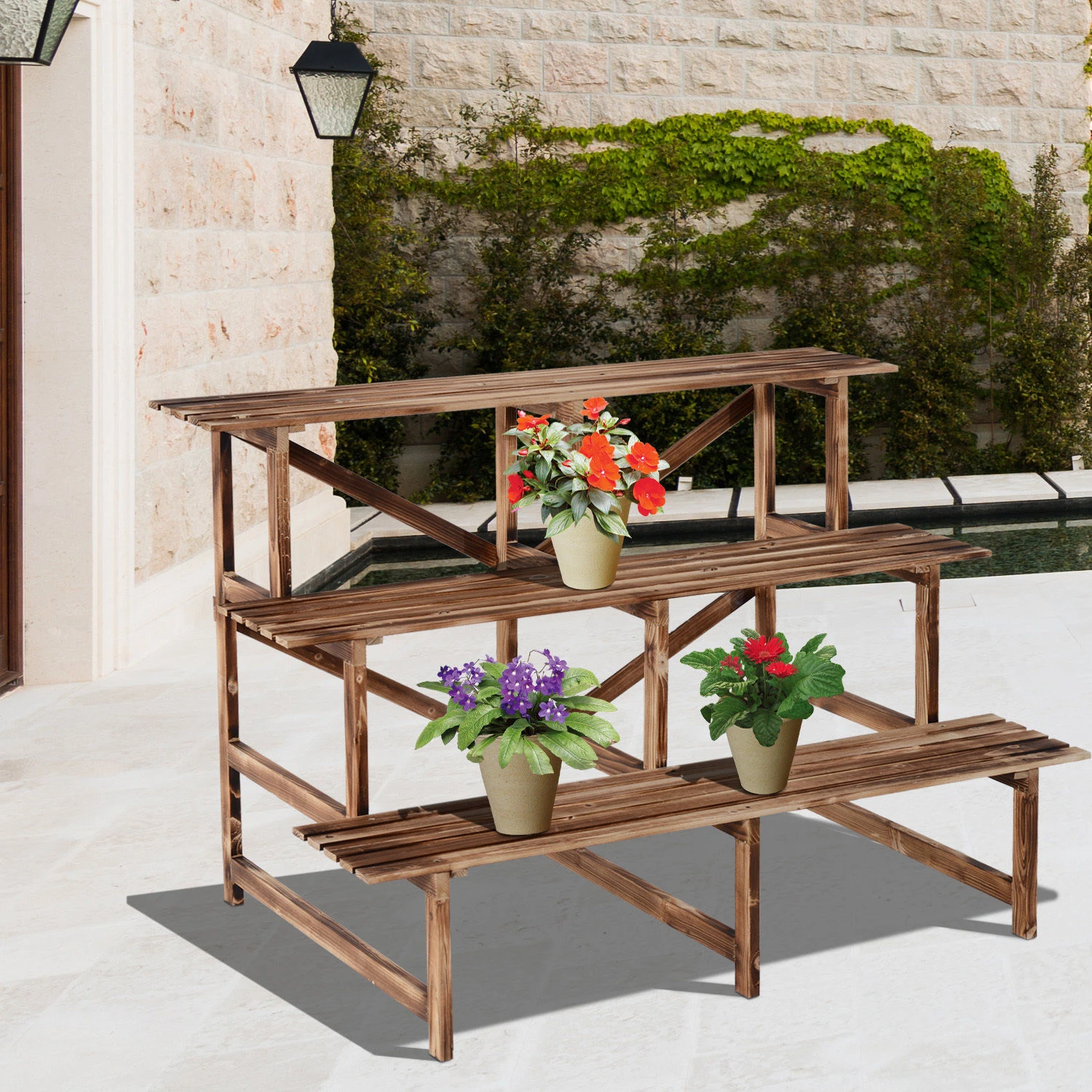 Mit unserer Pflanzentreppe holen Sie sich einen dekorativen und praktischen Helfer nach Hause. Ansehnlich lassen sich Ihre Topfpflanzen auf den großzügigen Stellflächen platzieren. Insgesamt 3 Treppenstufen unterschiedlicher Höhe lassen Sie Ihre Pflanzen gut sortieren. Robustes Tannenholz wird zur Herstellung Ihres Blumenregals verwendet. Damit es beständig gegenüber Witterungseinflüssen und Verrottung ist, wird es karbonisiert. Die dadurch entstehende dunkle Färbung versprüht einen leichten Vintage-Charme und verschönert Ihr Zuhause gekonnt. Mit einer Größe von L120 x W80 x H80 cm ist Ihre Blumenbank überdies groß bemessen. Sie bietet ausreichend Platz für Gemüse, Kräuter und Zierpflanzen und macht sich daher hervorragend auf der Terrasse oder im Garten. So verschönern Sie Ihr grünes Kleinod und genießen Ihre Gartensaison entspannt.