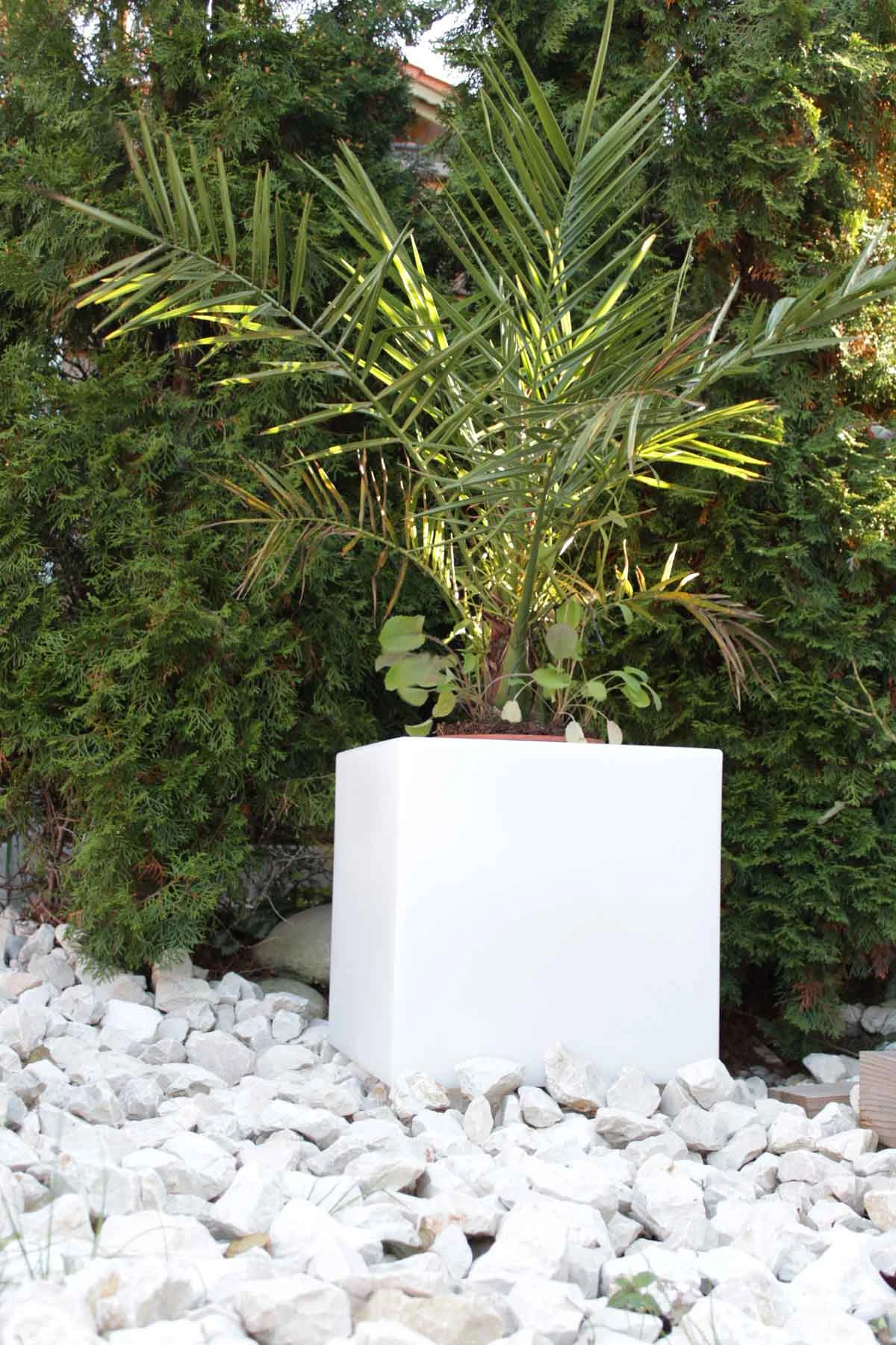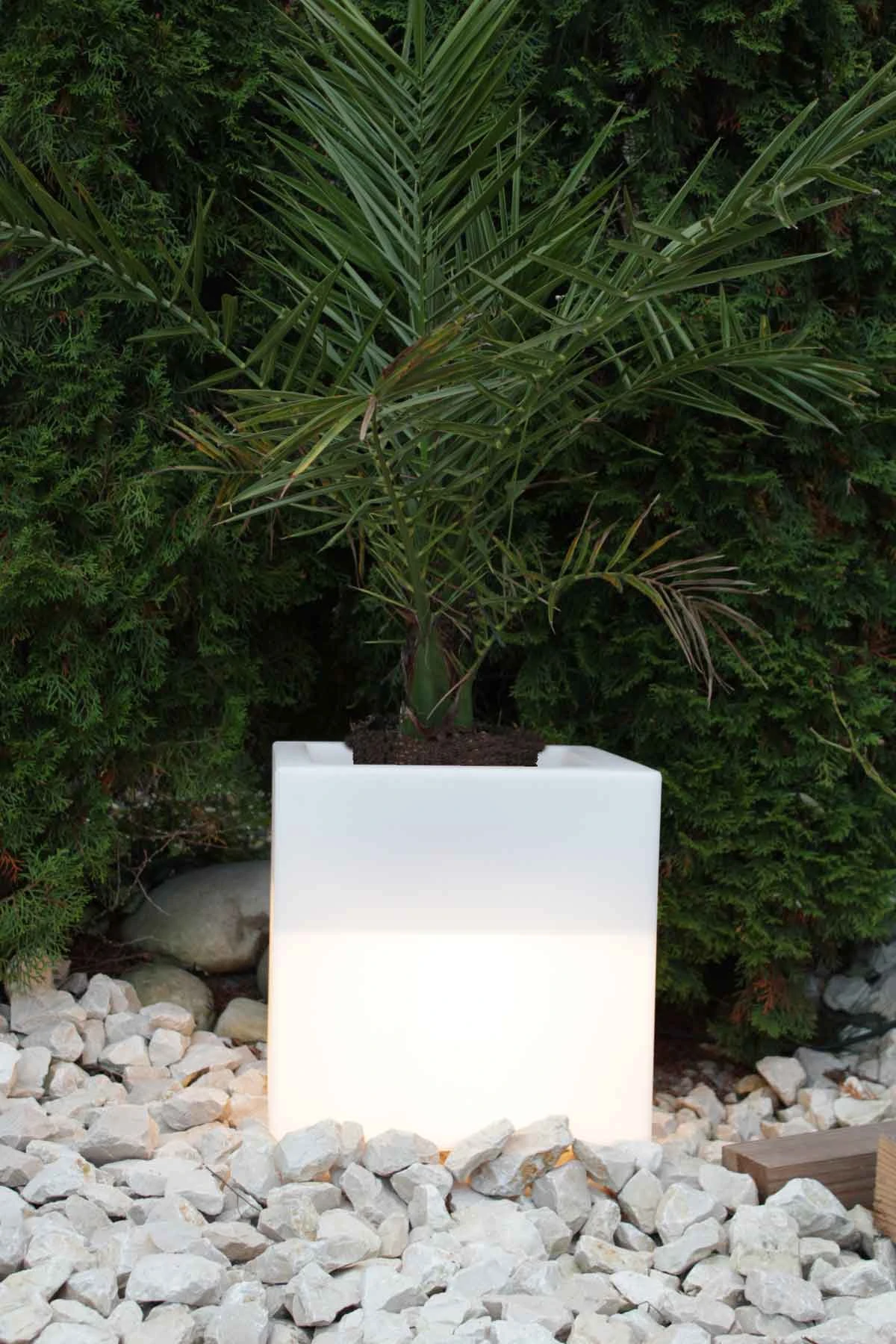 Hochwertiger Pflanzkübel in opalweiß. 38x38x38cm. Massive, robuste Bauweise. Leuchtend mit E27 Fassung. Durch sein Schutzklasse IP65 für Aussen und Innen geeignet.