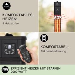 Mit der praktischen Fernbedienung lässt sich auf Knopfdruck die Wärmestufe verändern oder der Abschalttimer stundenweise bis 24 Stunden programmieren. Natürlich kann man den Heizstrahler auch direkt am Gerät an- oder ausschalten, eine Anzeige gibt dabei Auskunft über die gewählte Heizstufe. Ganz unbesorgt Aufenthalte auf Balkon oder Terrasse planen, ohne sich um die Temperaturen Gedanken zu machen: Mit einem Klick des Kippschalters erzeugt der Phantom Infrarot-Heizstrahler ohne lange Aufwärmphase direkt eine angenehme, heimelige Wärme.