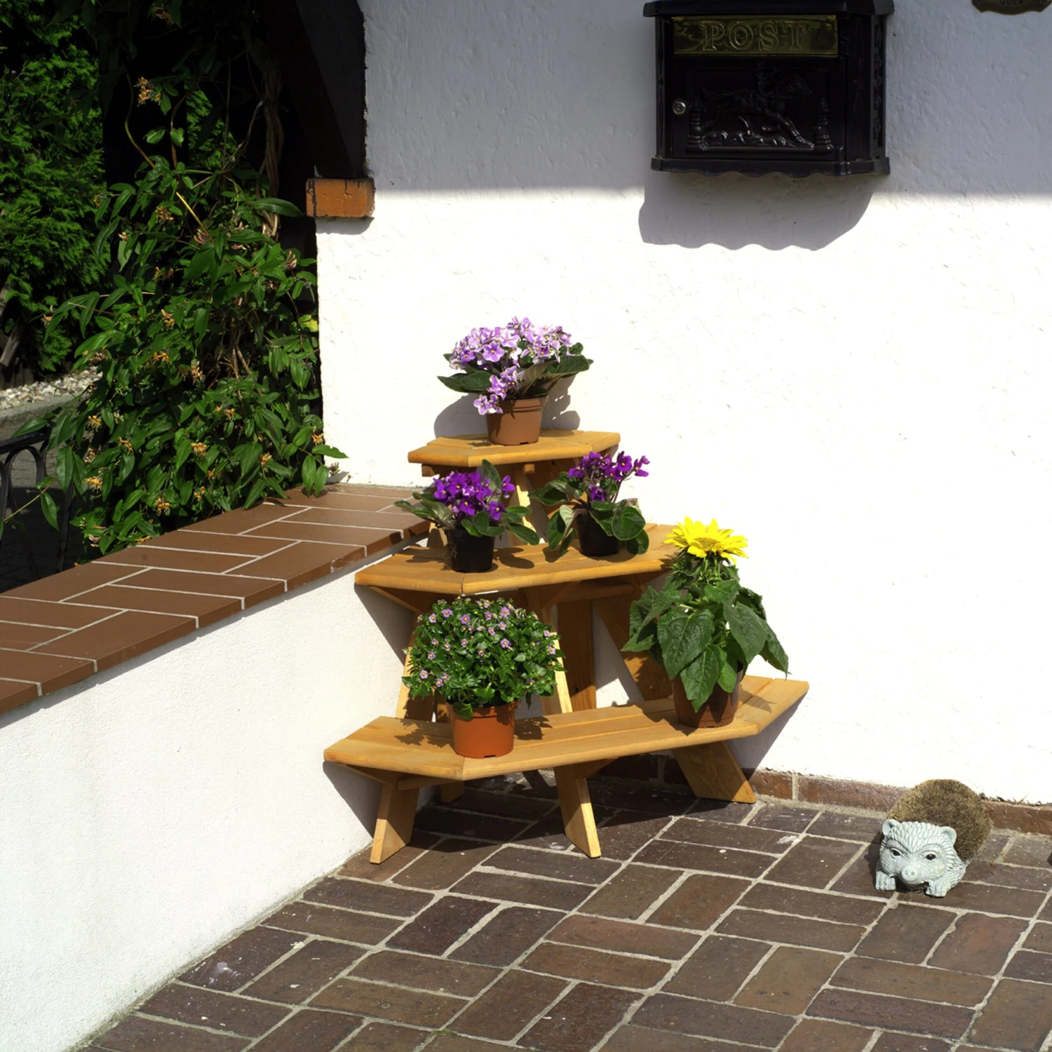 Mit diesem honigbraunen Eckelement einer Blumentreppe lassen sich ideal Hausecken verschönern. Zusammen mit dem als separaten Zubehör bestellbaren geraden Element ergeben sich verschiedene Kombinationsmöglichkeiten. Aber auch einzeln bietet dieses Eckelement einen schönen Anblick. Gefertigt aus massivem Kiefernholz, wetterfest imprägniert – für innen und außen.