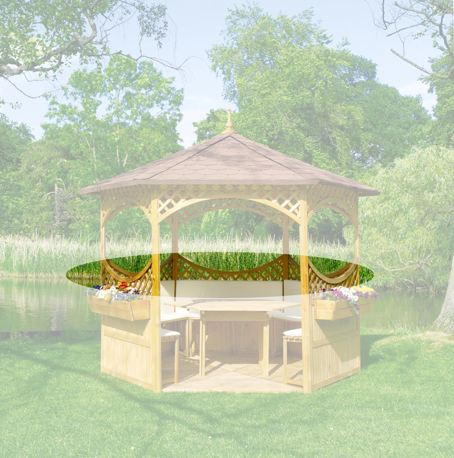 Dieses Zubehör für die Pavillon-Serie „Palma“ besteht 5 unteren Rundbögen mit Spalier und ist aus imprägniertem Kiefernholz gefertigt. Der Pavillon „Palma“ als Basisartikel muss separat bestellt werden.