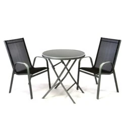 Dieses ist ein 3-teiliges Gartengarnitur Set bestehend aus zwei Stühlen / Stapelstühlen und einem Klapptisch mit schwarzer Glasplatte für Bereiche mit begrenztem Platz. Das leichte Sitzmöbel-Set eignet sich somit bestens für Ihren Balkon, kleine Terrassen oder Ihren Wintergarten.