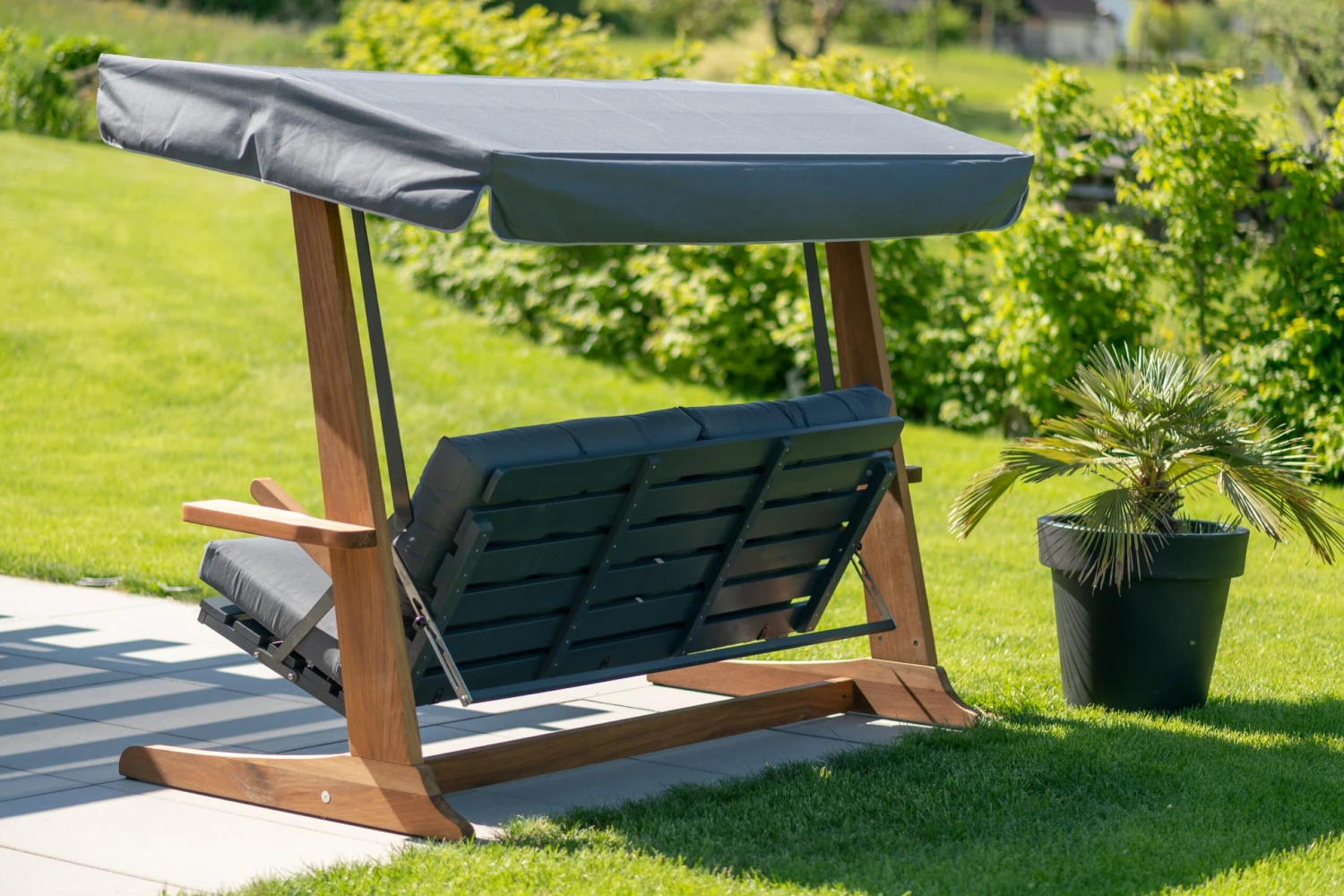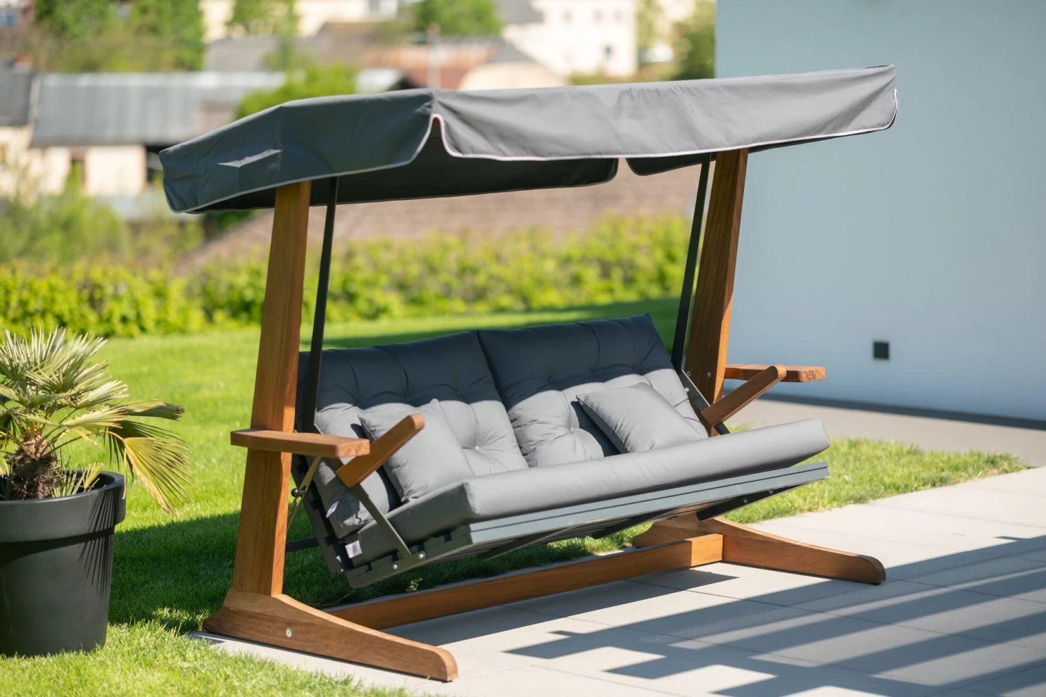 Die schlichten Farben für Polsterung und Baldachin komplettieren den modernen, hochwertigen Look der Westmann Hollywoodschaukel.