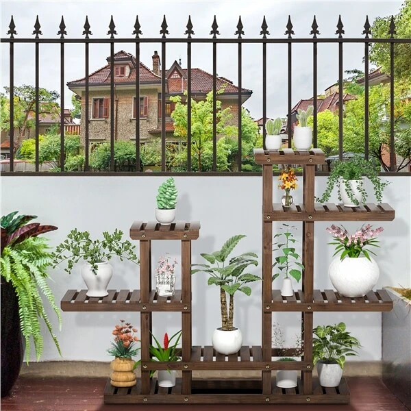 Möchten Sie Ihrem Zimmer frische Elemente hinzufügen? Zeigen Sie Ihre blühende Zimmerpflanze oder ein frisches Blumenarrangement auf unserem mehrstufigen Pflanzenstand. Dieser Holzblumenständer aus karbonisierendem behandeltem Tannenholz mit Lackierung zeichnet sich durch eine gute Haltbarkeit und eine natürliche Farbe aus. Es verfügt über 8 Plattformen, die in 6 Ebenen verteilt sind und ausreichenden Platz für mehrere Topfpflanzen. Es kann auch ein Ausstellungsstand für Fotos, Kunsthandwerk, Bücher im Wohnzimmer, auf der Terrasse und am Balkon sein und als Ablagefach für Toilettenartikel, Handtücher, Hüte im Badezimmer, Flur, Schlafzimmr, Küche usw. dienen.